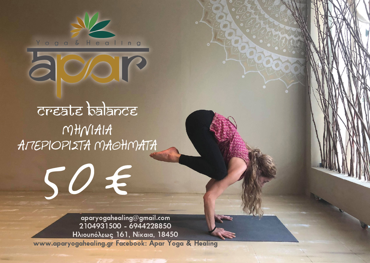 To Αpar Υoga & Ηealing είναι ένας νέος, ιδιαίτερος χώρος που στοχεύει στην καλλιέργεια της ισορροπίας μεταξύ του Νου και Σώματος. Μέσω της εναλλακτικής άσκησης προσπαθεί να προσεγγίσει τον σύγχρονο τρόπο ζωής και τους έντονους ρυθμούς της καθημερινότητας, με μία διαφορετική, όμορφη και απαλλαγμένη από το στρες ματιά. Μέσα από εξειδικευμένα προγράμματα yoga προσεκτικά σχεδιασμένα ώστε να ανταποκρίνονται στις ανάγκες σας, που μας ενεργοποιούν και μας κάνουν πιο δυνατούς προσφέρει μια ξεχωριστή νότα ευεξίας στην καθημερινή σας ζωή! Ashtanga Yoga- Hatha Yoga- Kundalini- Ενεργειακές Θεραπείες- Γιόγκα-Τμήματα για όλους- Reiki- Σαμανικές Θεραπείες- Medatation- Χαλάρωση- Ευεξία- Μαρία Ντούσκα- Mary Douska- Ηλιουπόλεως -Νίκαια-Πειραιάς-Νεάπολη-Κορυδαλλός-Αιγάλεω-Κερατσίνι-Πέραμα-Ταμπούρια-Δραπετσώνα-Άγιος Ιωάννης Ρέντης - ΩΡΑΡΙΟ ΛΕΙΤΟΥΡΓΙΑΣ Δευ 8:00 π.μ. – 9:00 μ.μ. Τρί 8:00 π.μ. – 9:00 μ.μ. Τετ 8:00 π.μ. – 9:00 μ.μ. Πέμ 8:00 π.μ. – 9:00μ.μ. Παρ 8:00 π.μ. – 9:00 μ.μ. Σάβ 10:00 π.μ. – 12:30 μ.μ.
